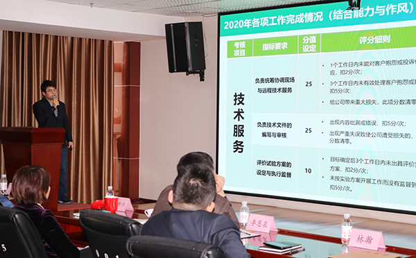 會(huì)上,公司35位中高層經(jīng)營(yíng)管理干部對(duì)自己一年來(lái)的履職情況和重點(diǎn)工作做了系統(tǒng)總結(jié),對(duì)工作中存在的問(wèn)題和不足展開了深刻剖析,并對(duì)2021年度工作思路和重點(diǎn)工作科學(xué)規(guī)劃。臺(tái)下人員認(rèn)真聆聽,并依據(jù)考核方案,對(duì)述職干部客觀公正地打分評(píng)價(jià)。