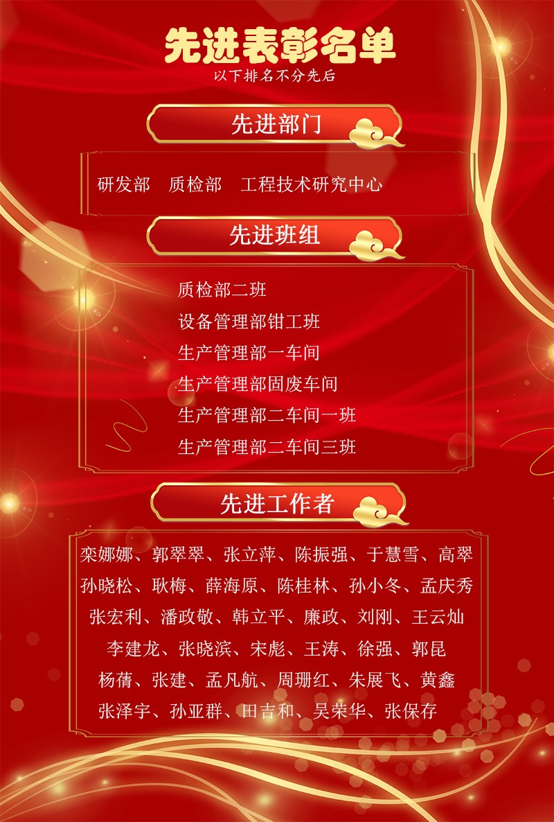 為表彰先進(jìn),樹立楷模,1月24日下午,公司2021年度先進(jìn)表彰儀式在研發(fā)中心會(huì)議室隆重舉行,儀式現(xiàn)場(chǎng)對(duì)先進(jìn)工作者、先進(jìn)班組、先進(jìn)部門進(jìn)行表彰嘉獎(jiǎng)。公司董事長、總經(jīng)理張新功,公司各級(jí)經(jīng)營管理干部及先進(jìn)工作者、先進(jìn)班組及部門代表參加了儀式。