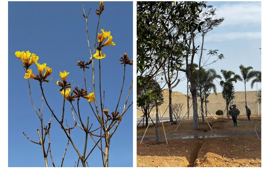 2023年3月12日,東粵環(huán)保的生產(chǎn)區(qū)域煥然一新。生產(chǎn)樓大門前的狐尾椰子樹,搖曳生姿,獨(dú)領(lǐng)風(fēng)騷;一旁的桂花樹,沉靜內(nèi)斂,毫不遜色;與其相陪襯的還有灰莉球、黃金葉球等,象征著樸素自然、清潔純凈。最引人矚目的莫過于黃花風(fēng)鈴木,黃色的花蕾映照綠樹婆娑的身影,更顯生機(jī)活力,象征感恩的寓意。