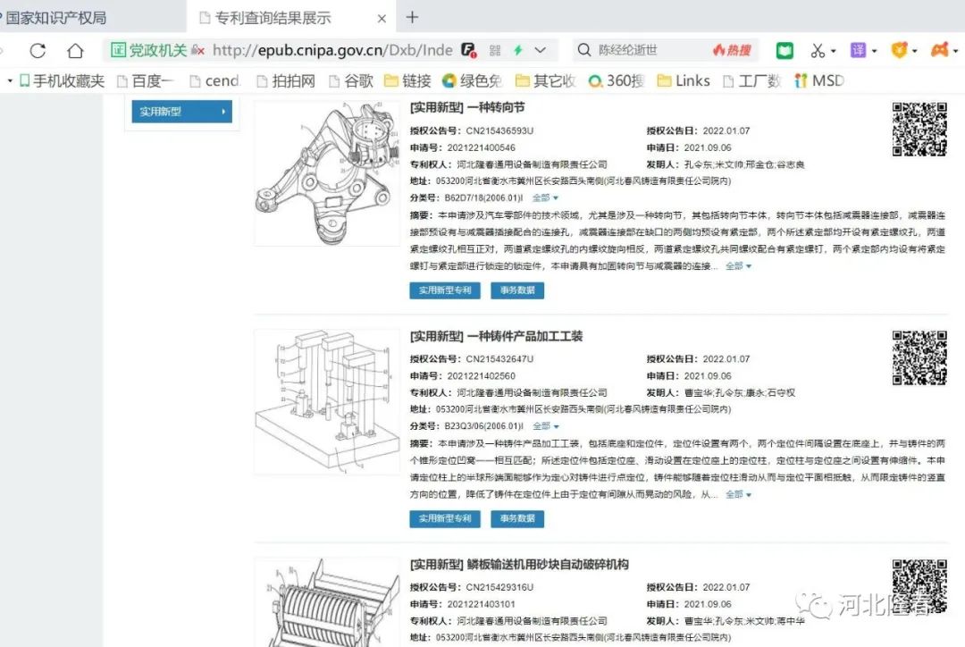 近日,據(jù)國家知識(shí)產(chǎn)權(quán)局網(wǎng)站公告顯示,河北隆春通用設(shè)備制造有限責(zé)任公司獲得多項(xiàng)專利授權(quán), 其中實(shí)用新型專利包括一種轉(zhuǎn)向節(jié)、一種鑄件產(chǎn)品加工工裝、鱗板輸送機(jī)用砂塊自動(dòng)破碎機(jī)構(gòu)、一種垂直分型制芯機(jī)砂芯內(nèi)嵌冷鐵芯盒結(jié)構(gòu)等多項(xiàng)專利。