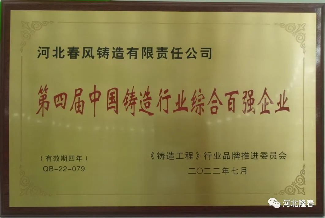這已經(jīng)是隆春公司連續(xù)四次獲得中國鑄造行業(yè)排頭兵企業(yè)和中國鑄造行業(yè)綜合百強(qiáng)企業(yè)榮譽稱號,充分顯示了隆春公司在中國鑄造行業(yè)的實力和影響力。隆春公司將進(jìn)一步加快發(fā)展,再接再厲,確保在行業(yè)的領(lǐng)先地位。